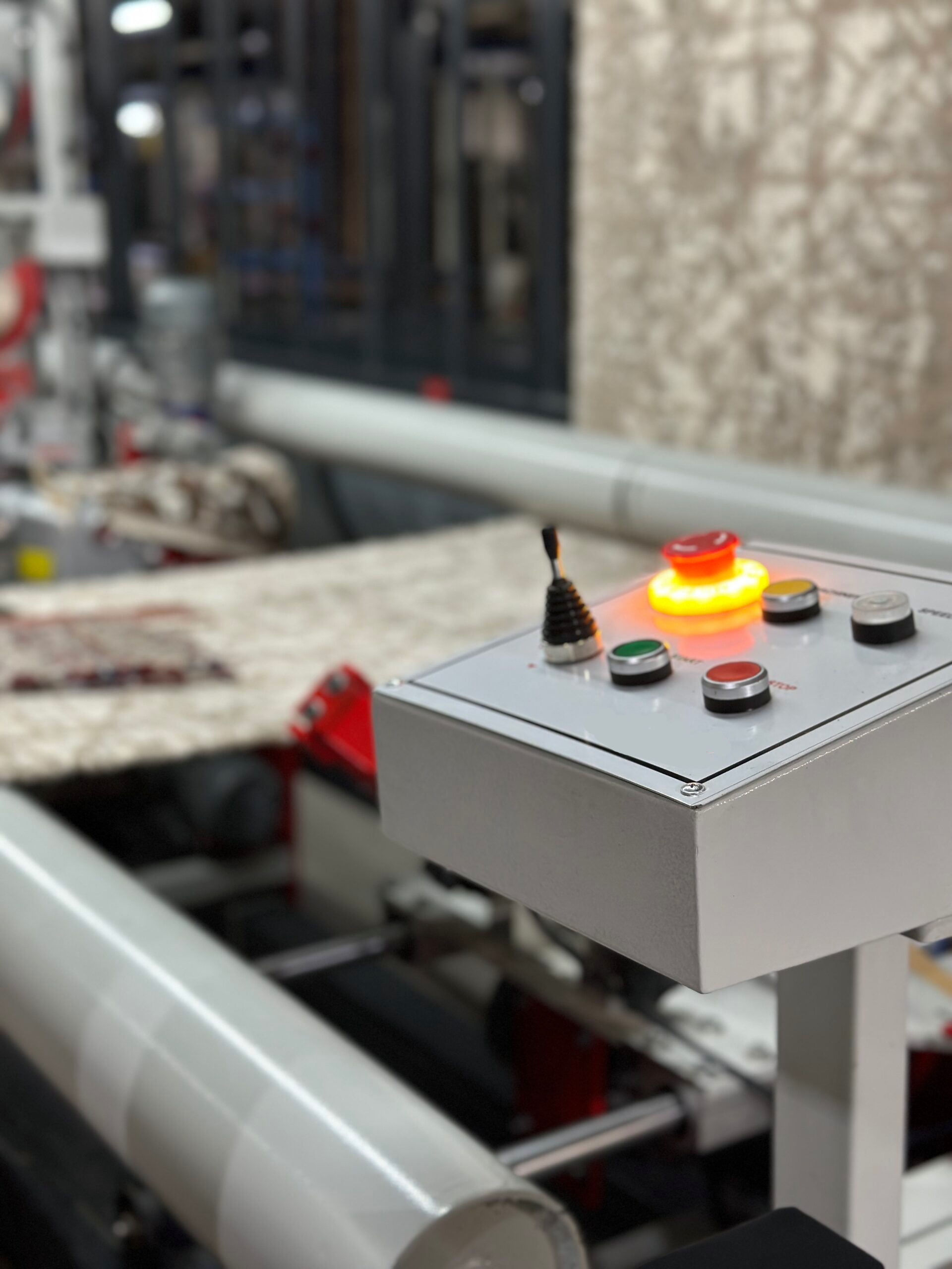 Hız kontrollü olarak çalışan makine dokuma tezgahlarından çıkan halıların ve ensiz yollukların her iki kenarını birden overlok etmeye yarar.