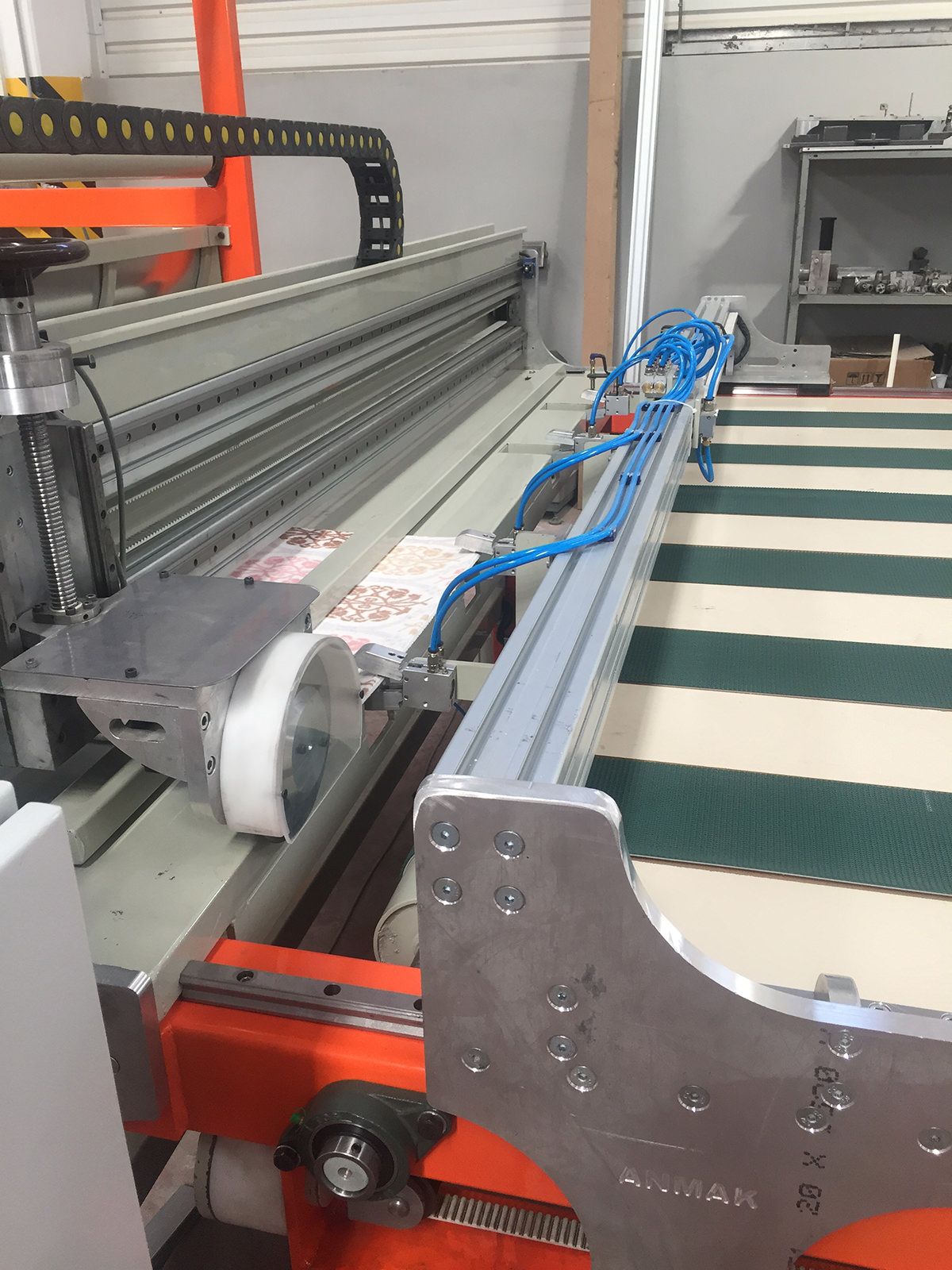 Halı ebatlama makinesi, dokumadan çıkan halıların istenilen ölçüde kesme ünitesinde ki özel sensörler vasıtasıyla pozisyon alıp düz bir şekilde hız kontrollü olarak kesilebilmesine olanak sağlayan bir makinedir.